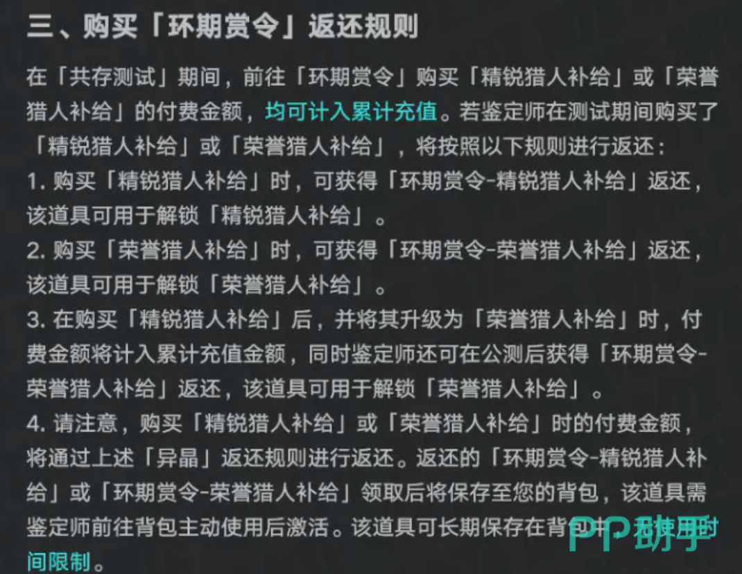 战令类道具返还流程简洁明确。测试阶段购入的“精锐猎人补给”或“荣耀猎人补给”,其支付金额将全额计入充值统计,并在公测开启后以1:1比例等额返还对应战令道具。返还道具同样存入背包,长期有效,但需玩家主动点击激活。该返还机制严格延续测试期战令进度与权益层级,确保上线首日即可直接解锁高阶奖励与功能权限,显著优化新手成长路径与长期留存体验。