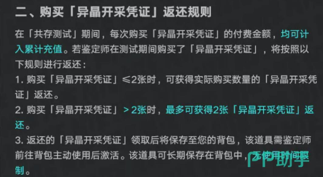 “异晶开采凭证”即玩家所称的“异环通行证”,其返还采取“现金金额+对应道具”双轨并行模式。所有购买通行证所支付的费用,均计入用户账号的累计充值总额,并依据异晶返还标准统一结算。关于道具返还,每位账号最多可领取两张通行证返还款项;若测试期间购买三张或以上,仍仅限返还一张。返还所得通行证将直接发放至玩家背包,无存放时限限制,激活后自生效日起享有30天使用期,期内可完整解锁全部绑定权益。