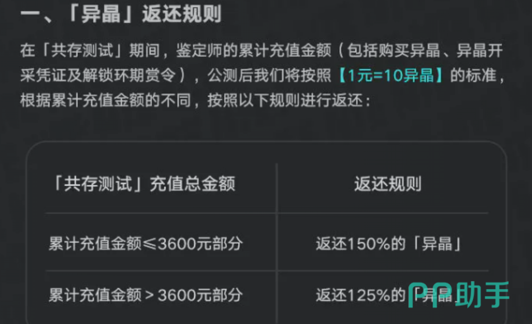 异晶返还为本次返还体系中的关键组成部分。游戏内设定1元人民币=10异晶的固定换算关系,返还按阶梯比例执行:累计充值金额≤3600元部分,按150%比例返还异晶;超出3600元的部分,则按125%比例返还。无论充值规模大小,所有参与测试的玩家均可获得高于原始投入的异晶资源,切实提升公测初期的养成效率与内容体验深度。