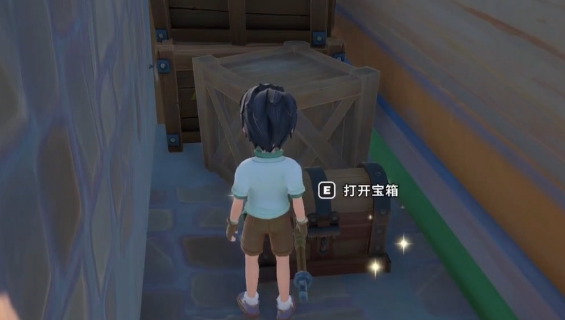 第二只宝箱设置于建筑外部空间。从驿站正门直接步出,前方即为延伸式露天阳台结构,地面铺设石板,边缘配有矮栏。宝箱静置在阳台中央偏右位置,无任何遮蔽物,视觉辨识度较高。开启后稳定获取50枚金币,该数额在游戏初期经济体系中属于可观的启动资金,足以购置多组基础种植种子或工具升级材料。