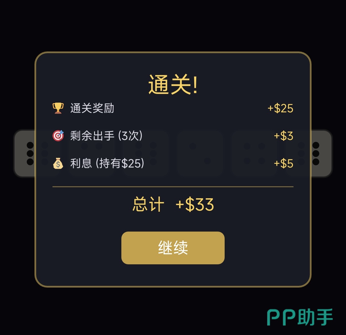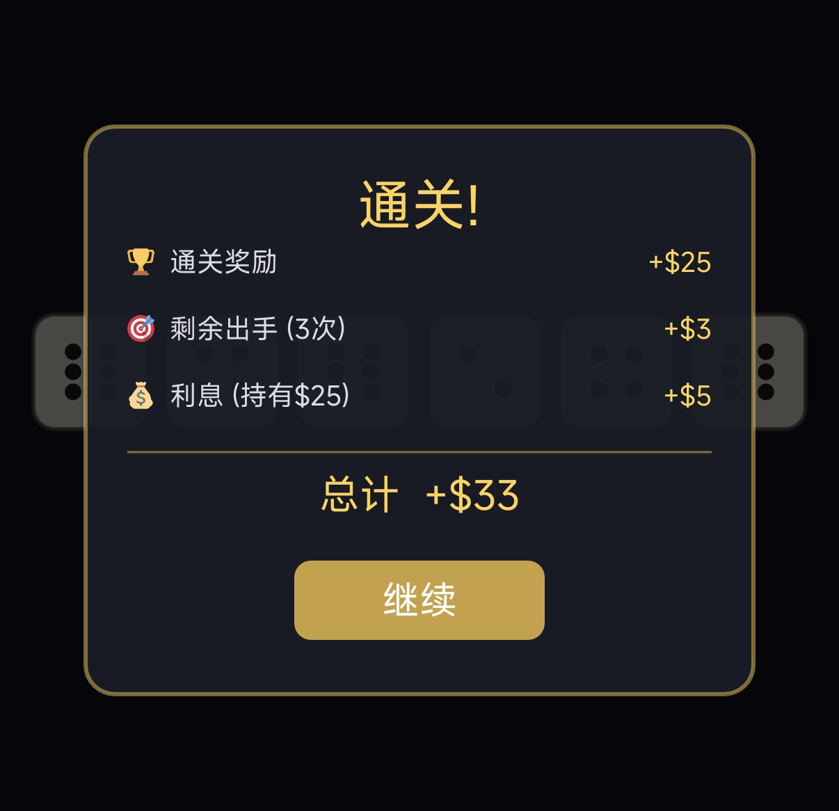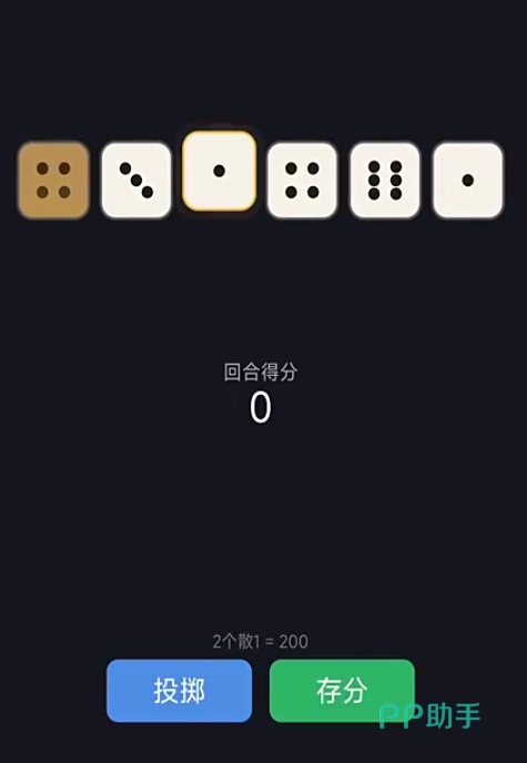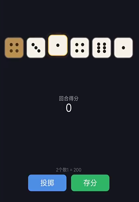 游戏采用标准六面骰设定,开局投掷6枚骰子构建积分路径。其中,1点与5点为固定计分面,三枚及以上相同点数(如三个2、四个4)则触发倍率加分,累计达成目标分数即可通关。规则简洁,但决策深度突出。