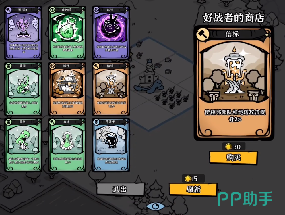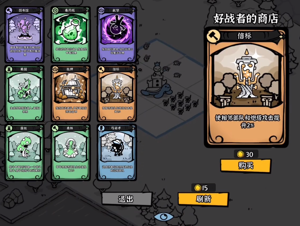BOSS战固定于第5至第8回合之间触发。击败小BOSS后开放一次商店界面,所售卡牌多为资源增益类或部队强化类。初期建议优先选择提升资源产量的卡牌,稳固经济基础可显著提升后期应对变数的能力;若无资源类选项,则转向提升部队生命值或攻击力的卡牌。防御类卡牌不作推荐:一方面,其单位伤害转化效率偏低,常出现塔防输出未生效而主力部队已溃散的情况;另一方面,中后期战斗焦点集中于前排单位博弈,静态防御设施作用大幅弱化。