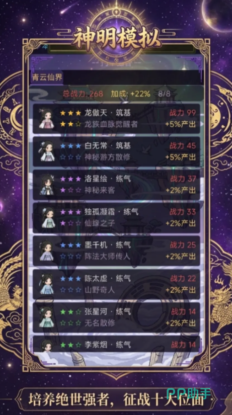 游戏采用深度叙事驱动的神格成长体系。开局时,万界仅存残破位面与微弱信仰余烬,玩家需通过事件抉择、资源调度与神职建设,重建秩序。每位可召唤角色均具备唯一资质标签、专属称号及星级成长路径,既可代行征战、开拓秘境,亦可在后期镇守关键位面节点,形成多维治理结构。随着本源积累与信仰值提升,角色将突破凡神桎梏,进阶为能重塑法则的创世之神。