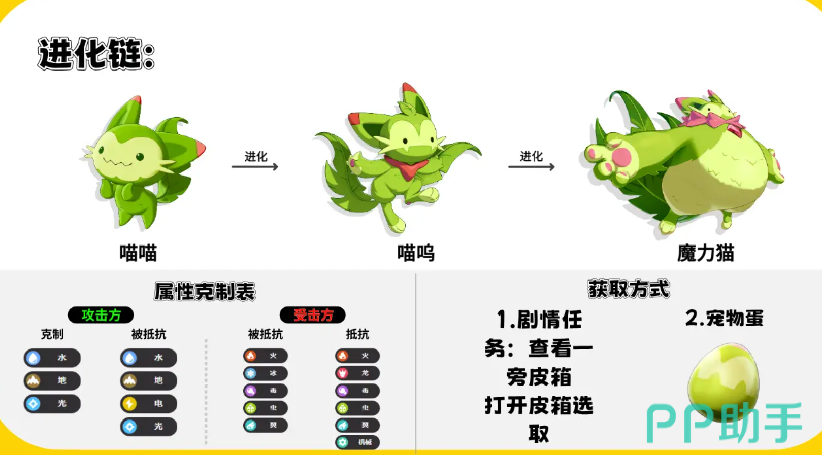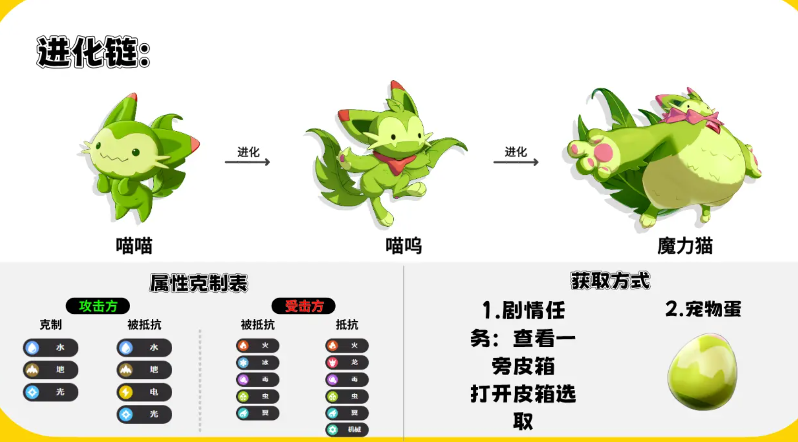 每一只宠物都有着不同的进化方式,而喵喵进化就是比较简单的。在攒够足够的经验提升到系统所要求的等级之后,小伙伴们只需要使用阳光收集瓶,然后在特定的时间前往指定的地点,就能够顺利的让喵喵进化了。喵喵一共可以进化两次在第1次进化之后将会变成喵呜,第2次进化之后将会变成魔力喵,另外,由于游戏内存在着属性之间的克制关系,因此小编也把喵喵的克制表给放在了文章中,小伙伴们可以直接查阅。