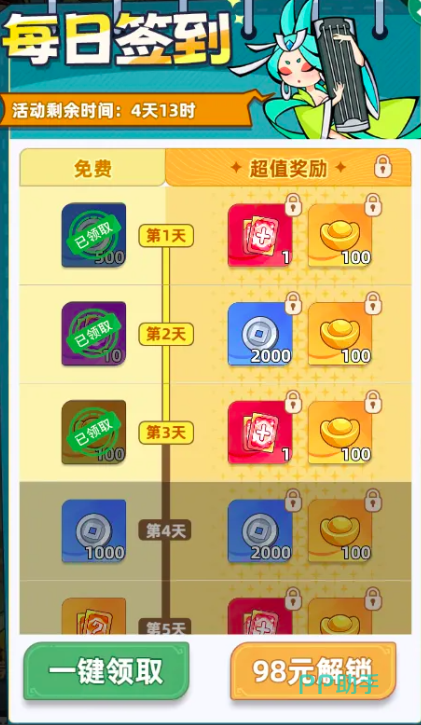 第三类值得关注的是签到类付费活动。基础签到对所有玩家开放,可积累基础资源;而付费解锁版则需98元,可直接获得5张自选红色英雄卡牌,同时附赠心愿兔。该档位资源集中度高,适合已有明确阵容规划、希望一步到位补强核心战力的中度投入玩家。
