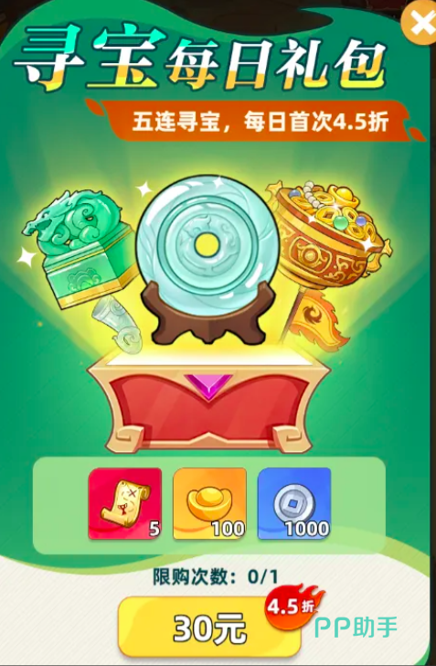 最后是寻宝礼包,售价30元,主打高频互动与碎片化资源积累。购买后可开启每日五连寻宝功能,稳定产出地图碎片、元宝及银钱,属于兼顾趣味性与实用性的补充型投入,适合作为日常资源补给的辅助手段。
