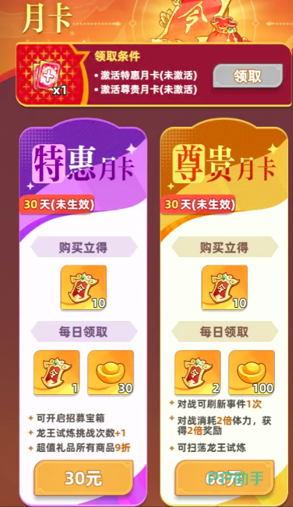 小月卡定价68元,定位为效率型选择:首充即赠令牌×10,后续每日可领令牌×2+元宝×100。虽投入高于大月卡,但令牌获取速率翻倍,对急需快速组建主力阵容或冲刺高难度关卡的用户更具实际意义。是否入手需结合个人时间成本与目标节奏综合判断。