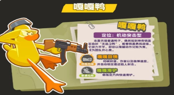 除鹦乐鸟外,嘎嘎鸭同样是新手友好且机制成熟的高适配角色。其标志性外观为手持锅盖造型,兼具趣味性与辨识度。该角色拥有双重功能性:一方面,其终极技能可同步提升射击速率、基础攻击力及换弹速度,并自动索敌锁定最近目标,大幅降低瞄准与操作门槛;另一方面,配备方向可控的位移技能,支持快速位移以规避伤害或调整交战距离。两项技能联动使用,可在完成爆发输出后即时脱离战场,形成“打完即走”的高效循环,实战容错率与稳定性表现优异。