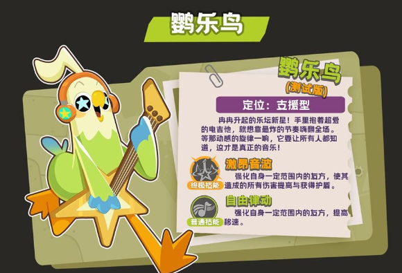 鹦乐鸟是游戏中定位鲜明的辅助型角色,与其他输出向角色形成差异化分工。其核心价值不在于直接造成伤害,而在于强化团队整体作战效能。被动技能可为半径范围内的队友持续提供攻击力加成;主动大招释放后,不仅能进一步提升范围内友方单位的攻击强度,还会生成一层吸收伤害的护盾,显著提升集火阶段的生存与输出稳定性。另一项技能则赋予队友短时移动速度提升,大幅优化走位机动性——无论突进压制、侧翼包抄还是战术撤退,该效果均能有效支撑节奏转换。需注意的是,鹦乐鸟自身防御与输出能力有限,实战中应避免前排站位,优先选择中后方安全位置进行支援。