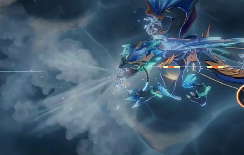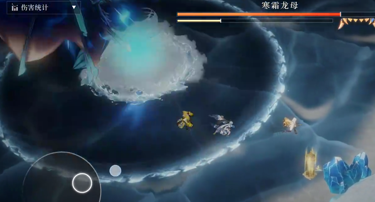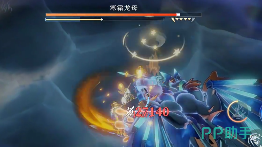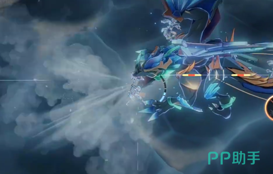 紧随其后的是一次逆时针方向90°角的极寒喷射,具有高额伤害及冻结效果,需根据BOSS头部转动方向进行同步位移才能有效闪避。之后她将升空盘旋一周后落地,并生成向外扩展的冰冻领域,只要保持在扩散圈外即可安全无伤。