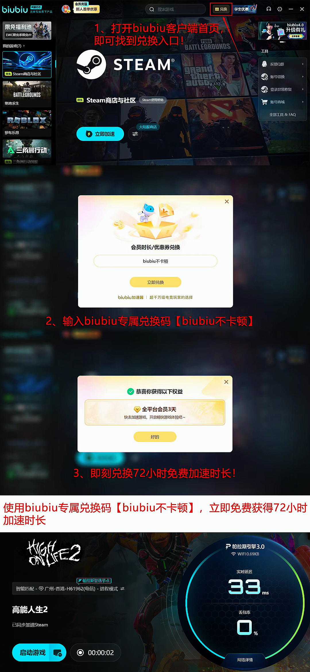 为回馈用户长期支持,现推出限时福利活动:所有用户输入兑换码【biubiu不卡顿】,即可获赠3天全游戏免费加速时长;新注册用户完成身份验证后,自动解锁24小时全场通用加速权益。