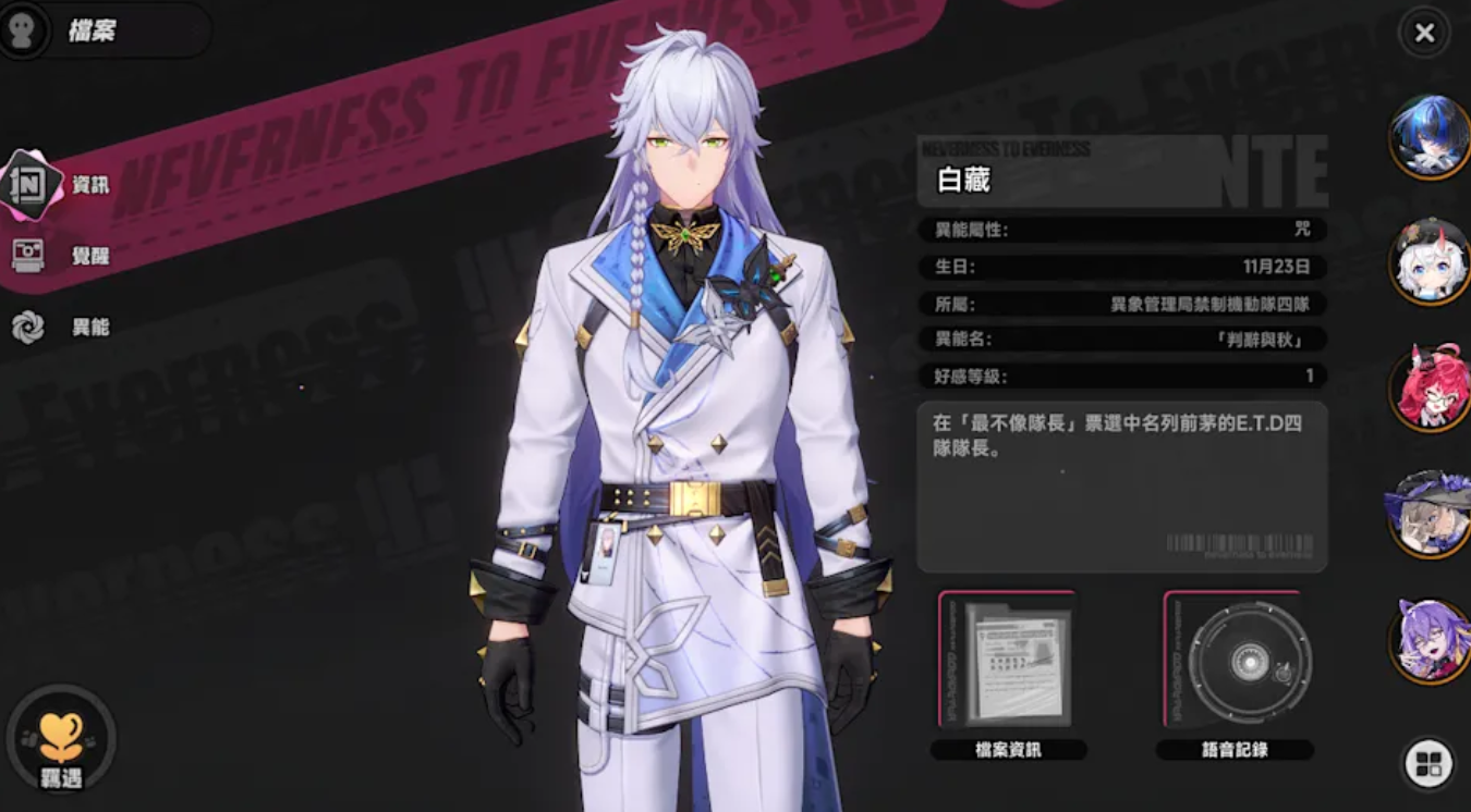 白藏作为异象管理局E.T.D四队队长,是专注极限爆发与仪式化战斗流程的咒异能系代表。其攻击系统围绕“噤”“詈”“祝”三类独立标记构建:普攻命中三次叠加“祝”,闪避反击触发“噤”,特殊普攻衔接技能施加“詈”。当极轨终结技领域激活后,不同标记组合将引发差异化爆发响应。尤为突出的是其斩杀判定机制——领域内敌方单位生命值低于10%(BOSS单位为5%)时,可直接触发即死效果,大幅提升高难副本中的节奏掌控效率与单体清场速度。