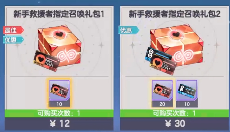 推荐顺序为:任意0.01元档位礼包 > 12元【新手救援者指定召唤礼包1】> 30元【新手救援者指定召唤礼包2】> 198元【新手救援者天使型精灵召唤礼包】=198元【新手救援者恶魔型精灵召唤礼包】> 其余同类商品。