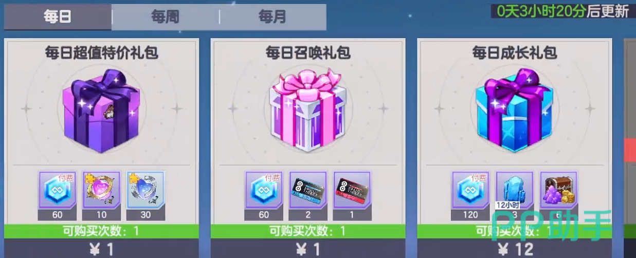 每日礼包:1元【每日召唤礼包】=1元【每日超值特价礼包】>12元【每日成长礼包】
