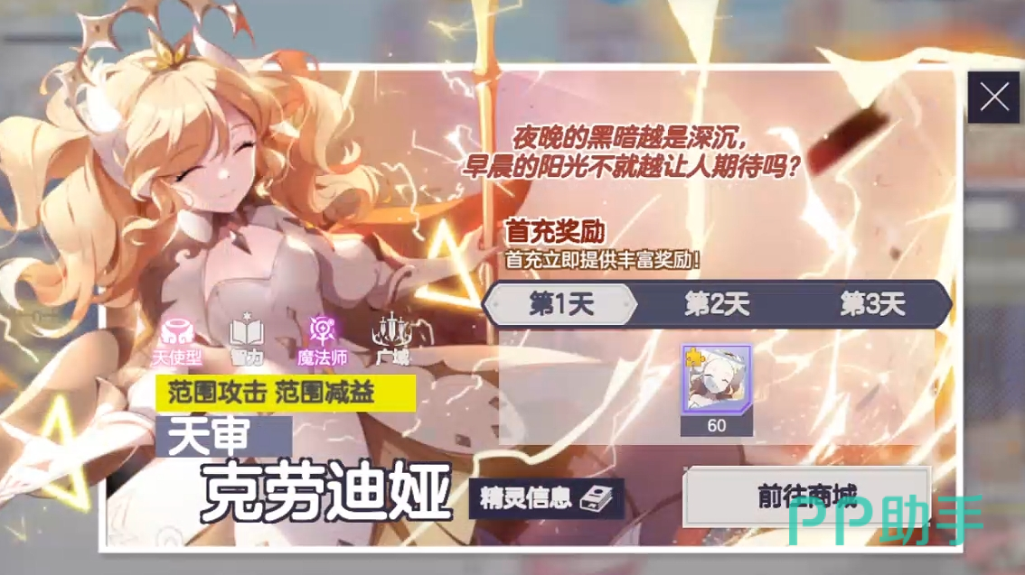 完成任意档位【新手救援者礼包】的购买即激活首充奖励,分三日发放,总计可获得120枚【精灵的记忆:克劳迪娅】,可合成2名完整【克劳迪娅】;同步获取【遗物召唤券】、【幸运花束】及【套装饰品选择箱子(传说+)】。