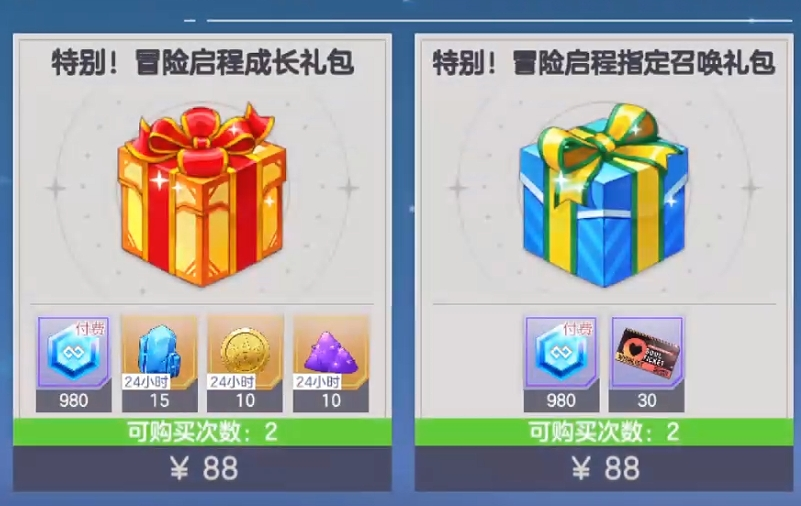 推荐顺序为:88元【冒险启程指定召唤礼包】>88元【冒险启程成长礼包】>其余同类商品。