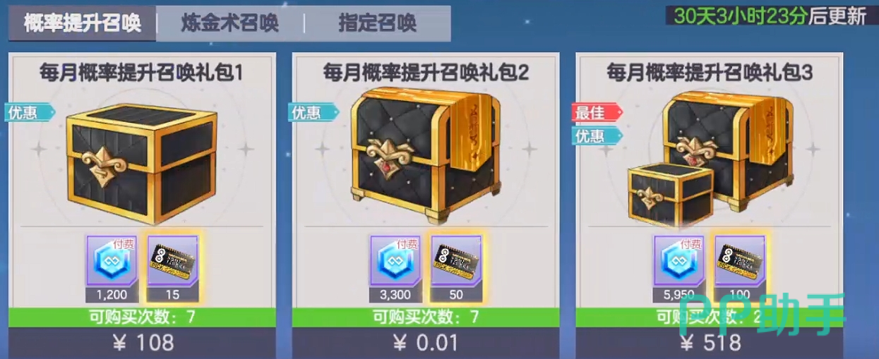 涵盖【概率提升召唤礼包】、【炼金术召唤礼包】与【指定召唤礼包】三种形式,每月重置购买次数。推荐优先选择任意0.01元档位礼包,其余商品依需求酌情选购。