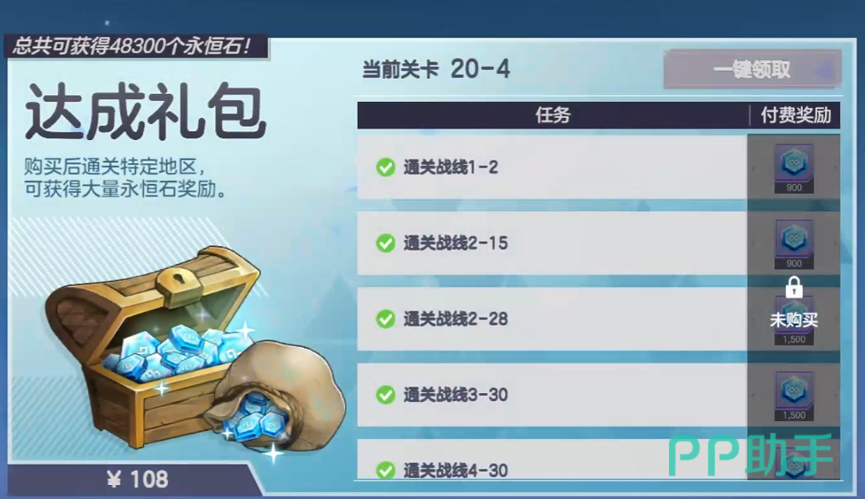 定价108元,需通关指定战线关卡后逐步领取,全部目标完成后共可获得48300枚【永恒石】。