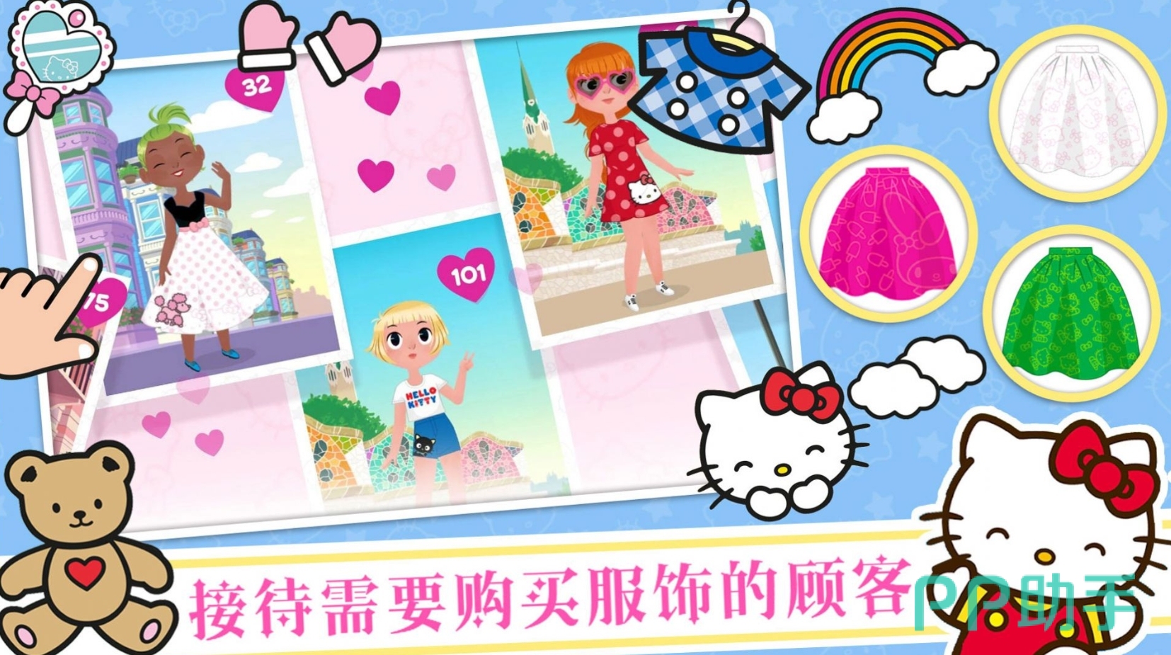 大伙将化身为凯蒂猫的合伙人,与它一道来进行服装店的经营,并为每位前来购物的顾客们推荐合适她们的装扮,让她们都能打扮得漂漂亮亮的。当然,这些顾客偶尔也会提出一些要求,需要人们使用特定的服饰来为其进行搭配。若是玩家的搭配效果好,她们还会为玩家进行店铺宣传,让大伙与凯蒂猫的店铺变得更有人气。