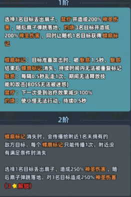 炽焰舞姬的战斗体系由两大主动技能构成,技能成长曲线明确,各阶段均有质变提升。一技能为单体穿透+范围压制复合技:投掷扇刃对首个目标造成200%神圣伤害;扇刃落地后触发范围灼烧,对周围3名敌人各造成200%神圣伤害,并随机赋予「扇标记」。该标记具备三重战术效果——目标进入攻击前摇即被魅惑1.5秒;同时施加禁疗效果,使敌方治疗类技能失效;灼烧状态还可使小怪强制定身0.5秒。需注意:该技能对Boss类单位不生效。