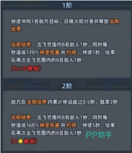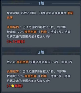 二技能主打群体控场与持续压制:一阶段突进过程中召唤火焰分身,对范围内最多8名敌人造成击飞效果,并在5秒内持续造成总计120%神圣伤害,附带灼烧效果;二阶段升级后,结界内每秒伤害提升至160%,且敌人在结界中移动累计超0.5秒即触发眩晕;三阶段进一步强化控制链,眩晕时长延长至3秒,结界持续时间同步提升,显著增强团队输出窗口与生存容错率。