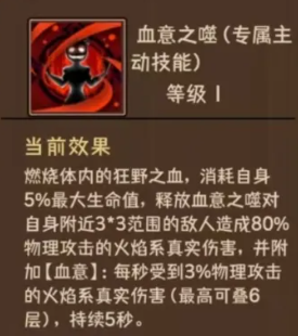 火系流派以主动技能“血意之噬”为核心,释放需先扣除自身5%生命值,可对3×3范围内的所有敌人造成80%物理伤害,并附加真实伤害型火焰效果。更重要的是,该技能会为目标施加“血意”状态,每层使目标每秒流失3%最大生命值,最高可叠加至6层。这意味着在多段技能循环下,火系狂战士不仅能打出可观的瞬时伤害,更能通过持续流血构建稳定的压制节奏,在PVE群怪与BOSS战中表现尤为突出。