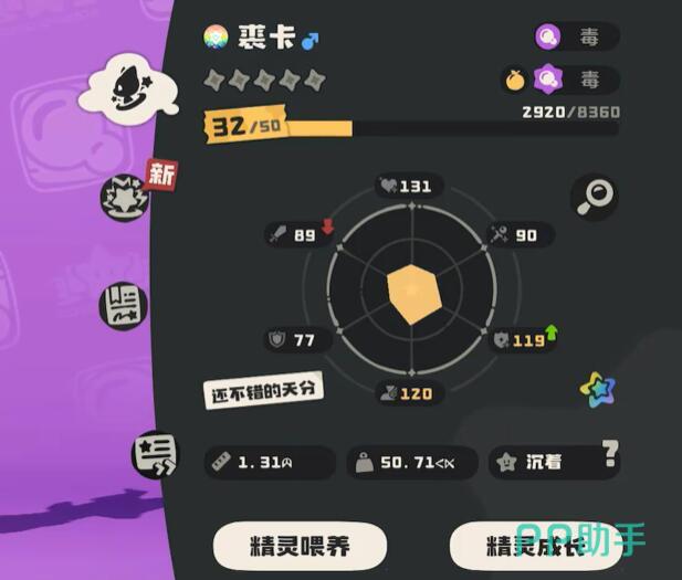 裘卡定位为双攻型输出,推荐孤僻(+物攻-魔抗)或调皮(+物攻-魔攻),最大化物攻优势。次选稳重(+魔攻-物攻)或马虎(+魔攻-魔抗),适配魔攻技能流派。属性培养优先物攻与速度。核心技能组合为十字毒牙+三角之力+毒爆弹+毒尘放射十字毒牙提升暴击率并附加中毒效果,三角之力触发多状态干扰,毒爆弹与毒尘放射强化持续伤害。PVE场景可替换毒尘放射为毒雾领域,提升群体控场能力。超进化后解锁剧毒新星,需配合中毒状态触发额外爆发。