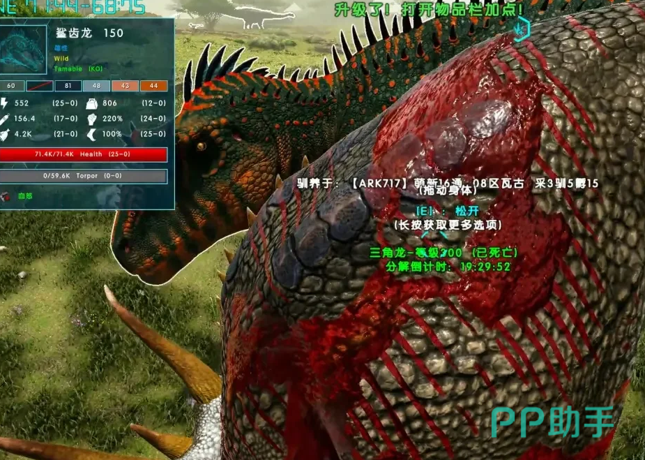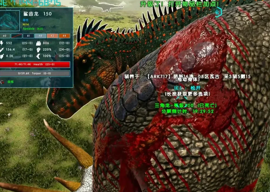实际操作前需完成两项基础准备:穿戴吉利服以降低视觉识别率;饮用仙人掌汤减少移动时产生的气味痕迹。随后定位目标鲨齿龙个体,保持安全距离观察其活动路径。接着击杀任意一只野生恐龙(推荐选择低威胁度生物如三角龙幼崽或剑龙),获取完整尸体。关键动作在于——使用鼠标左键持续按住该尸体并拖拽移动,全程不可松手。此时靠近鲨齿龙时,其AI将判定玩家为“食物提供者”而非威胁源,不会发起攻击。