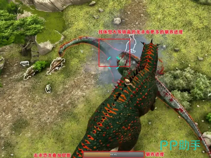 骑乘状态下需继续执行协同狩猎行为:每成功击杀一只新目标恐龙(无论野生或已驯化单位),均可为当前鲨齿龙叠加一次驯服值。高倍率服务器中,单次骑乘配合3–5次击杀即可达成100%驯服;默认倍率下则需重复骑乘—击杀循环至少4轮以上。全过程无需额外投喂、无需使用任何驯服道具,完全依赖动态交互行为驱动驯服进程。