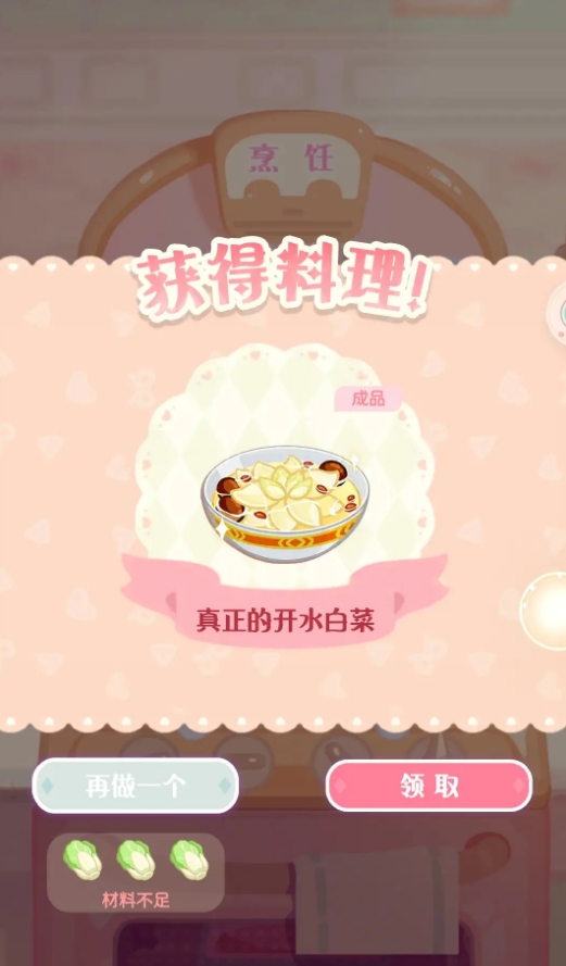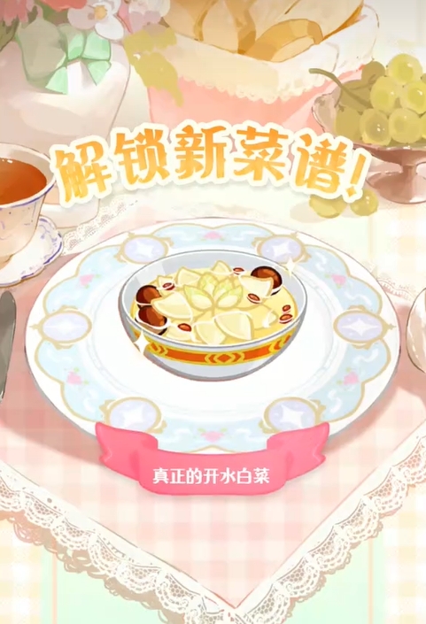 初次进行制作时会出现解锁菜谱的提示,玩家所收录的菜谱图鉴也将加一。该效果只在第一次制作出开水白菜时会有,往后不会再提示玩家。这道菜肴所需的原料获取较多,例如角色外出时有概率会将白菜带回来给玩家,当然玩家也可直接去美食商店购买,每颗白菜的售价为35金币,但要注意每天只能购买20颗白菜,超过上限后无法再次购买。