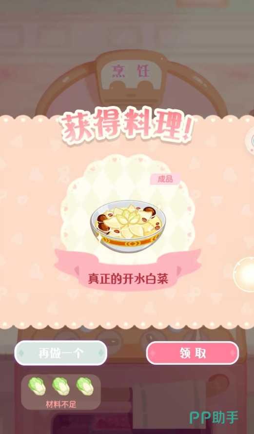 开水白菜在游戏里只需使用3个白菜就能制作,各位可在有空闲烹饪锅的情况下打开烹饪界面,并依次往锅里放入三个白菜,然后选择开始烹饪就能制作这道美食了。该美食在烹饪的过程中,需要玩家等待一段时间,这期间玩家可去做一些别的事,等烹饪时间走完就能得到开水白菜这一道美食。