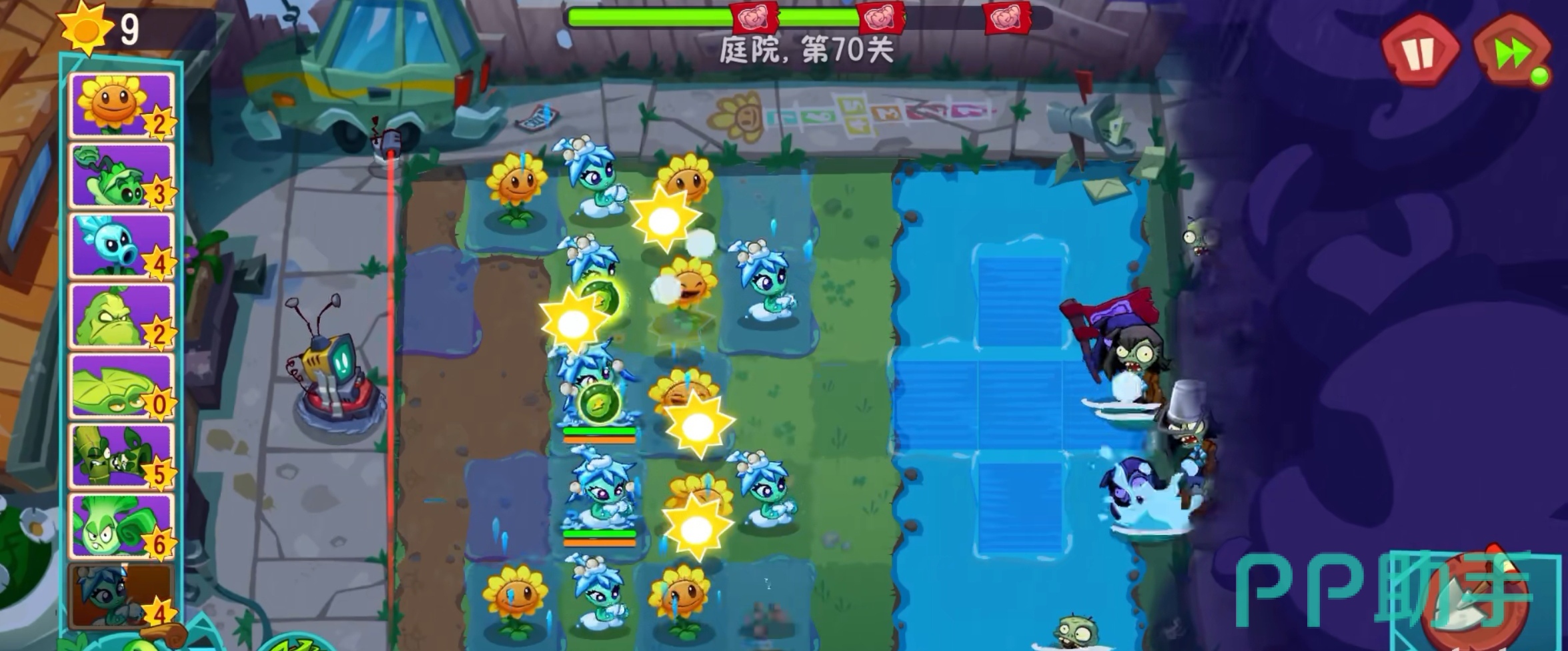 在对抗多种僵尸类型时,檞寄冰仙子展现出显著优势。面对火焰系敌人(如火焰舞王),它不仅能优先清除目标,还能熄灭其火焰并附加冻结效果。对于飞行单位如气球僵尸,其高抛弹道可直接命中并击落,无需依赖传统反空植物如仙人掌。