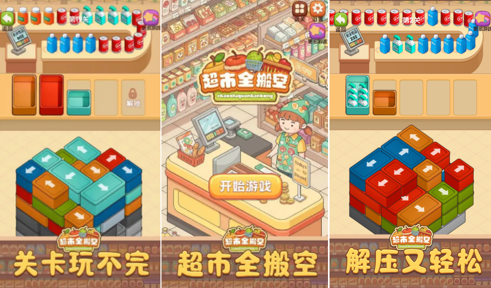 搬空超市是很多人的梦想,在现实生活中虽然无法实现,但超市全搬空能满足玩家的这种愿望,游戏里会有很多堆叠的方块,每一个方块上都会有不同指向的箭头,点击这些方块,他们就会朝着箭头方向移动滑出,每消除一层方块货架上的物品就能直接收到玩家的购物车里,赶快来游戏里通过不断消除搬空超市吧。