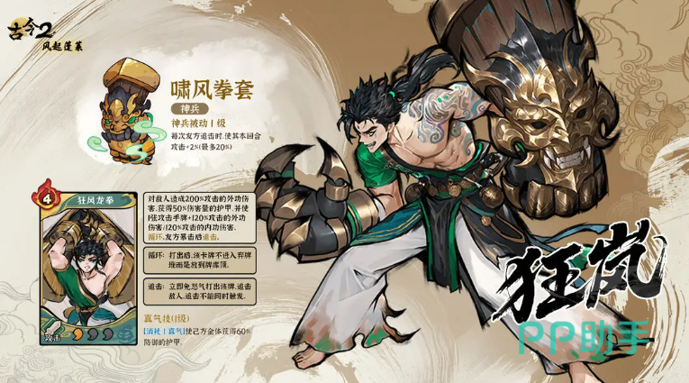 最后推荐风系限定角色狂岚。其外功面板数值突出,配合专属卡“碧风翎舞”可显著提升攻击频次。机制设计上,每回合最多触发5次攻击,每次均能通过手牌消耗获取怒气;当累计攻击达3次后,后续攻击牌的怒气消耗降低1点;且5次攻击全部完成时,手牌中所有攻击武学卡外功伤害提升70%。该多段式增伤结构使其在持久战与速攻场景中均具统治级表现。