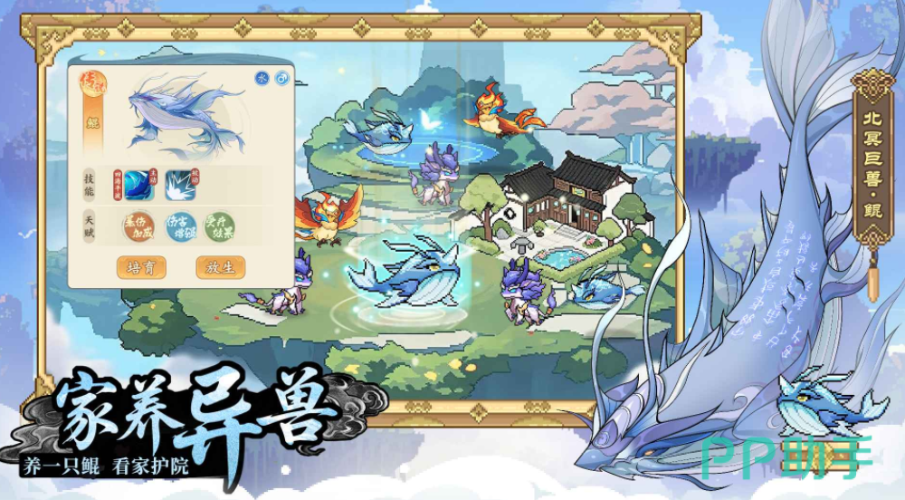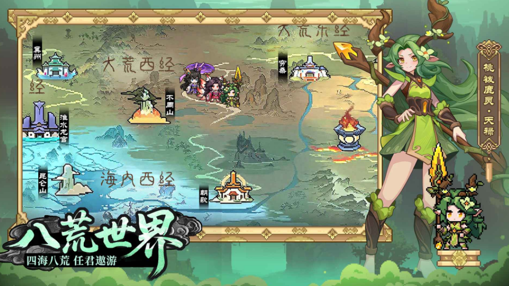 游戏里使用了比较复古的元素,在让玩画面的设定上,也是能家回忆到童年的像素元素,可以在这中经典视听拉满的场景中,和各大神话角色一起重现各种经典的神话故事,只要完成这些挑战,就可以带领角色进入到像素世界探索,驯化这些神兽,并且借助这些神话角色超强的战斗能力,完成各种经典战役的对抗,能在这个过程中了解到传统,也能感受到山海经文化的魅力,在游戏里会有大量不同的种族,每个玩家都可以通过培养,让这些不同种族的角色都有较强的战斗力。
