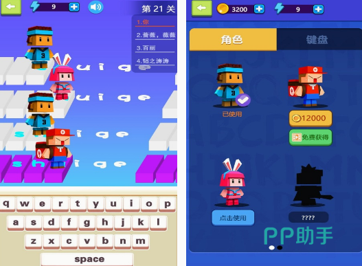 这款游戏不仅是通过拼音帮助你打字的,与拼音有很大的关系,它同样也是设计风格比较可爱的,里面有很多方块人的角色,只要是解锁以后,大家就能免费获得。当你成为游戏中的各种角色以后,就需要在每次闯关的时候,根据关卡所给出的文字,然后利用键盘打字的方式,将每个文字打出来就可以了,还有很多的键盘模型可选择。