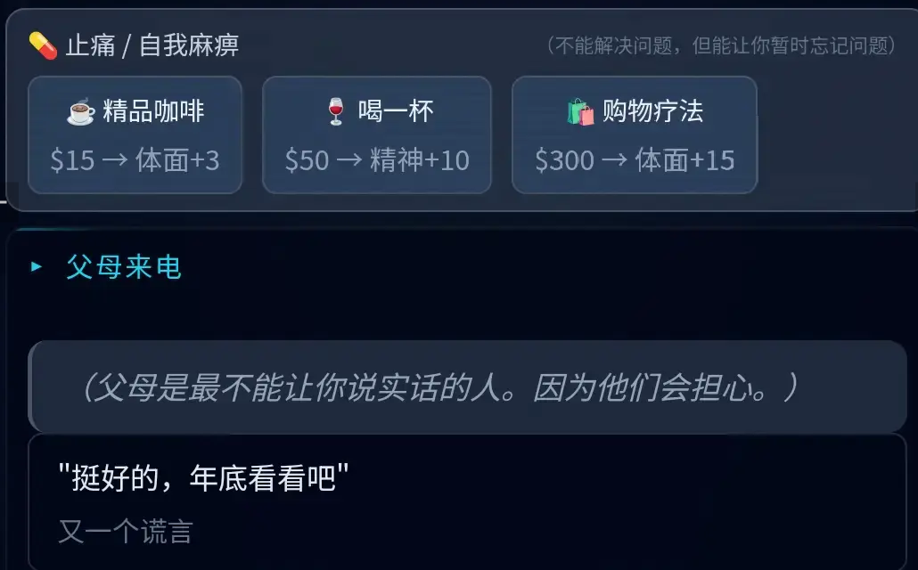 游戏机制进一步延伸至社会信用维度——当“体面值”低于阈值时,将直接影响求职面试资格,并可能触发签证失效风险,导致身份异常,进而牵涉家庭责任履行与代际关系张力。这种对现实生存规则的系统化映射,使玩家得以沉浸式体验当代职场人的多重压力源。