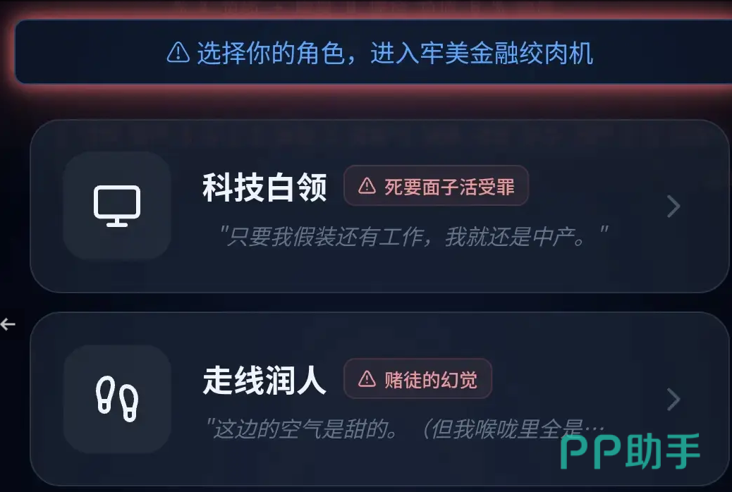 游戏提供科技白领、网络主播、自由撰稿人等多元职业路径,每种职业均配备专属红色文字说明,直观呈现其社会定位与生存逻辑。例如,科技白领表面光鲜,实则面临高强度加班与绩效压榨;网络主播虽具人气基础,却深陷流量波动与变现焦虑之中。不同选择将导向差异化的经济模型与人际关系发展线。