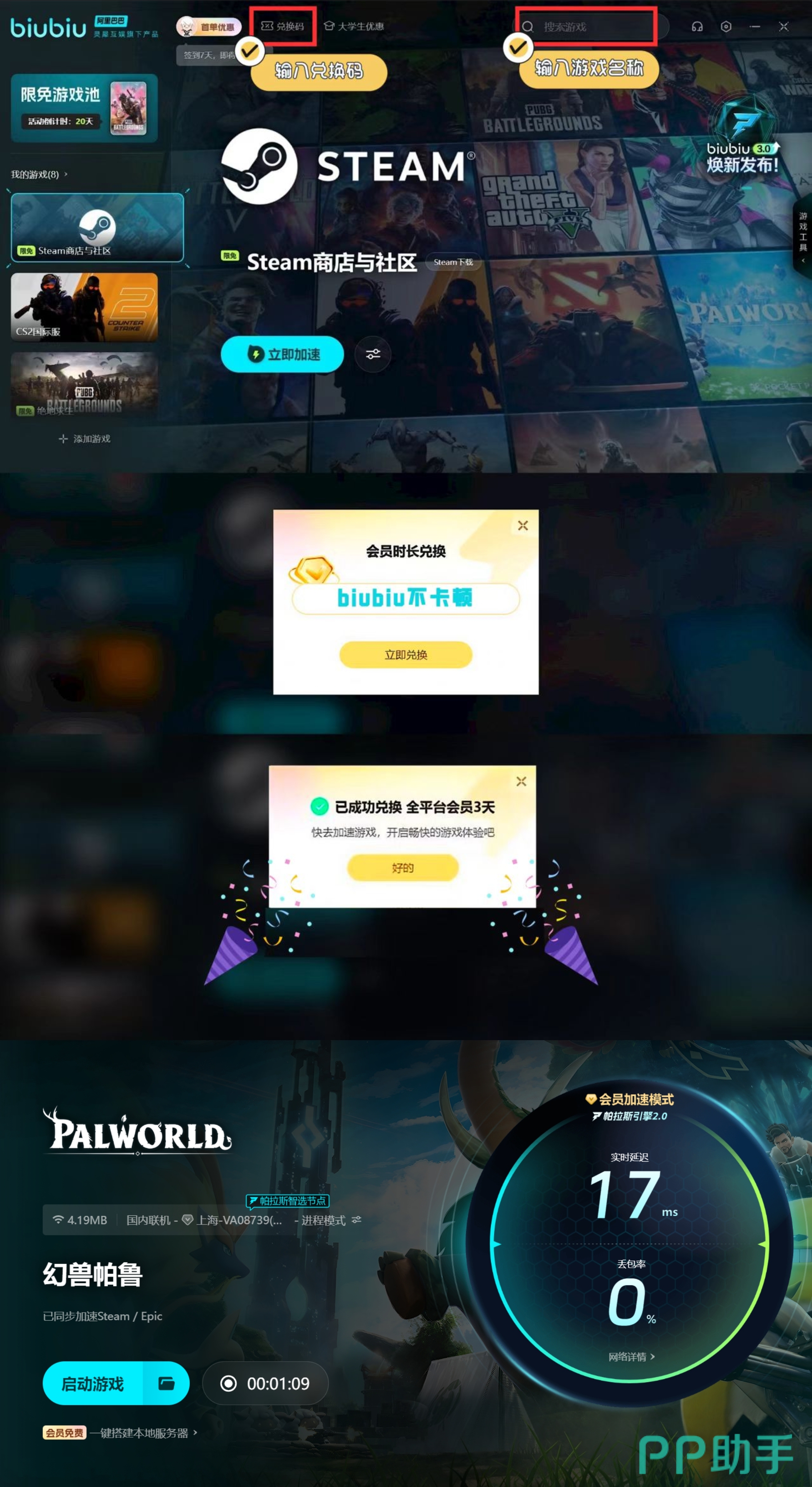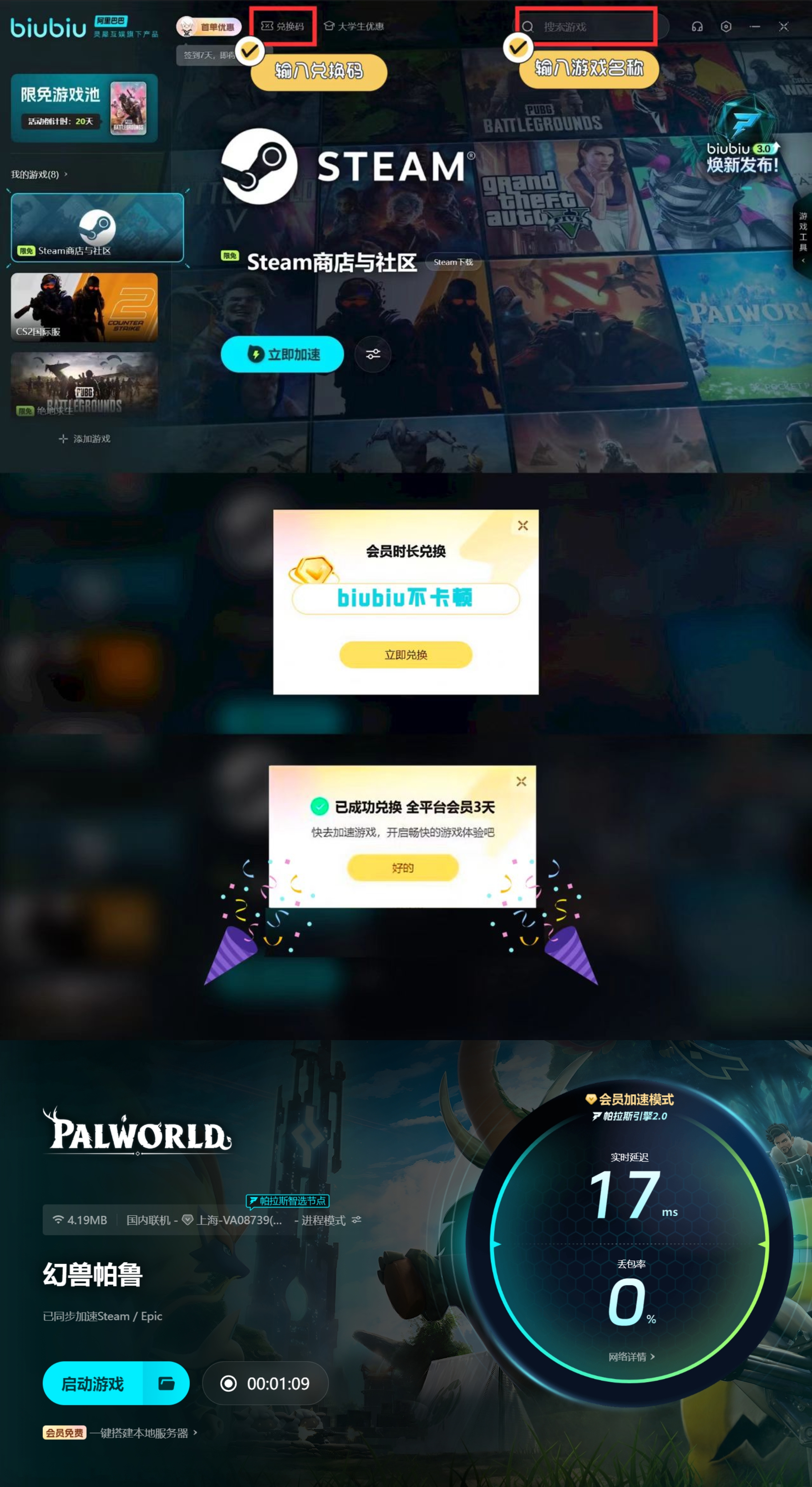 幻兽帕鲁在探索的旅途中,可以见识到不同类型的帕鲁,而玩家就可以选择一个比较安全的地方建造营地,将收集到的帕鲁放到营地内进行建造,让家园的设施和产出直线提升,而有些玩家会邀请其他玩家一同搭建家园,就是联机的过程中总是掉线,导致两个人的游玩体验很糟糕,那么就可以使用biubiu加速器,能有效让掉线问题得到解决,同时新人在注册后便获3小时免费加速,而且新老用户均可使用兑换码【biubiu不卡顿】可获3天免费的使用权哦!