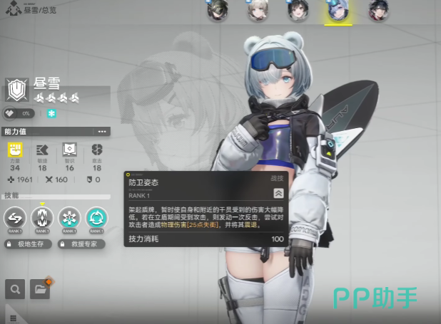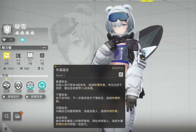 普攻技能【失温猛击】,对敌人造成4段攻击效果,作为玩家主控角色的时候能为敌人造成35点的失衡值。【防卫姿态】这个技能是她的1技能,能够在前方嘉起来盾牌,将受到的攻击降并且这个效果是能够影响到周围的干员角色,并且在受到攻击还会进行反击能对敌人造成伤害附加25点失衡和震退效果。