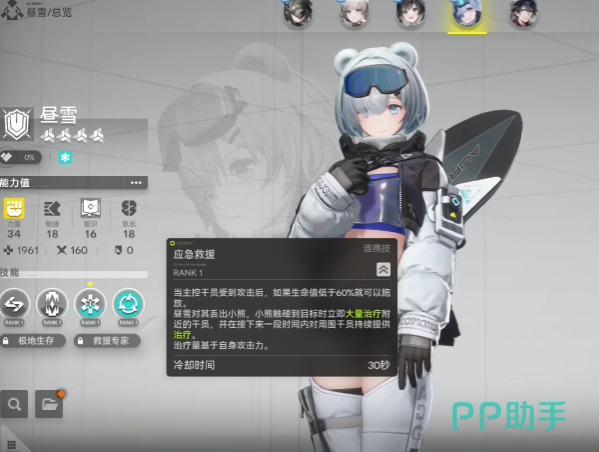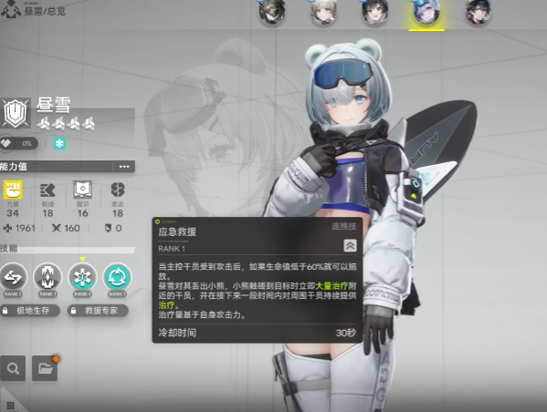 2技能【应急救援】当玩家控制的主干角色受到攻击,血量低于60%的时候这个技能就会自动释放,属于连携技能。昼雪将抛出小熊玩偶,玩偶接触到的队友都会进行大量的治疗效果,并且在小熊掉落的地址持续的为队友范围内进行回血。
