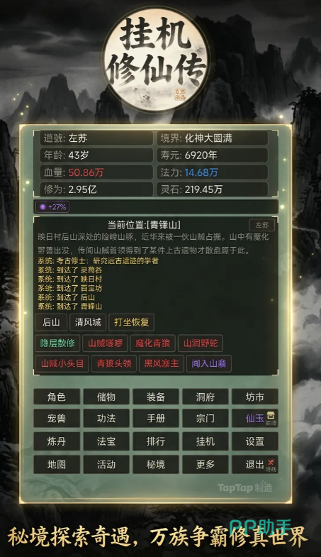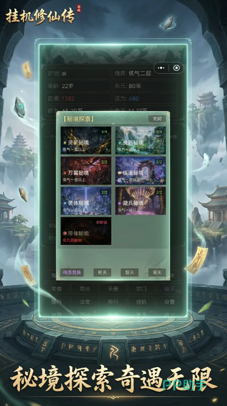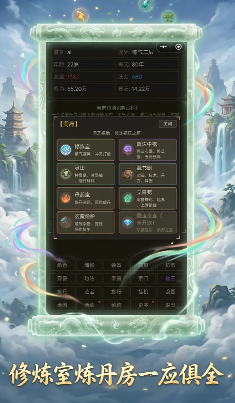 界面设计以极简文字交互为主,无复杂UI干扰,上手零门槛。针对同类产品中常见的“资源稀缺—材料卡点”问题,本作构建了多层级收益体系:日常任务、宗门贡献、秘境副本、自动探索、离线挂机等十余种渠道稳定产出灵石、灵草、精魄、器胚等关键资源,确保发育节奏平滑可控。