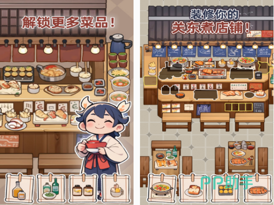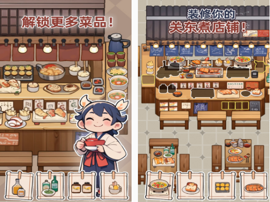 作为这款可制作关东煮经营小摊档的休闲游戏,在制作的过程中,你必须要正确的选购食材,然后满足客人的需求。在经营时,还能遇到很多温情的故事,需要保证每一串食物中,都能有丰富的材料,通过解锁更多的菜品,可让你在经营的过程中,满足更多人群的需求。整体的风格也是以日式为主的,能带给大家很多欢乐。