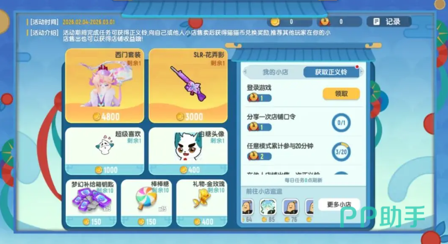 活动期间,玩家每日完成指定任务即可获得“正义铃”。该道具既可在他人小店寄售,也可上架至个人小店进行交易;成功售出后,寄售者与店主均可获得“猫猫币”。若其他玩家在你的小店完成购买,你还将额外获得一笔猫猫币分成,形成可持续的收益循环机制。