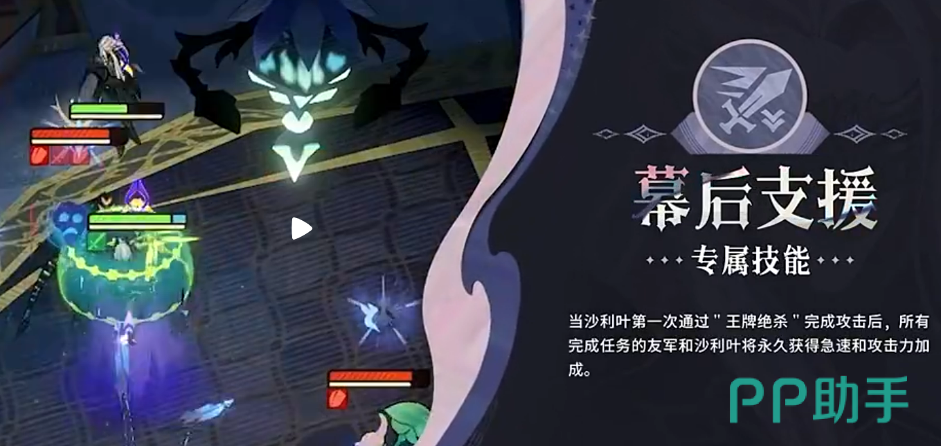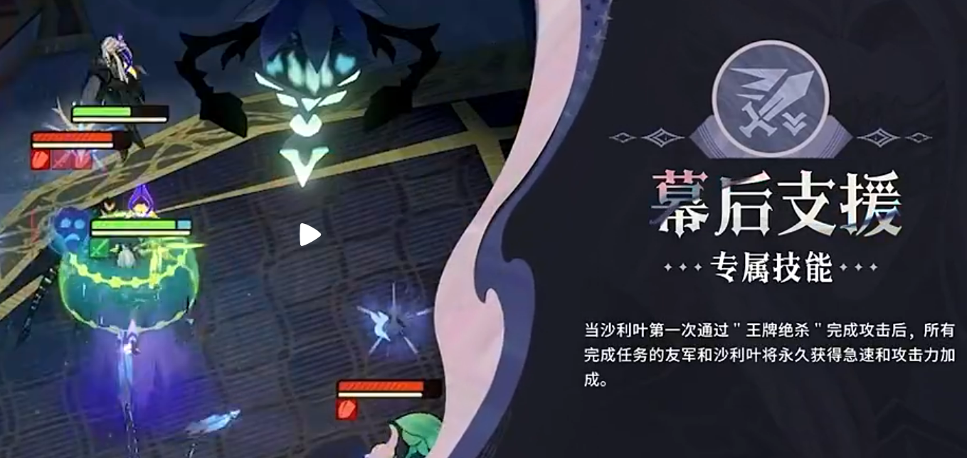 专属技能“幕后支援”进一步增强了沙利叶的战略价值。每当“王牌绝杀”成功发动后,所有完成任务的队友以及沙利叶自身都将永久获得急速与攻击力的双重加成。这一效果可叠加且持续至战斗结束,显著提升全队的出手频率与爆发能力,形成越战越强的滚雪球优势。