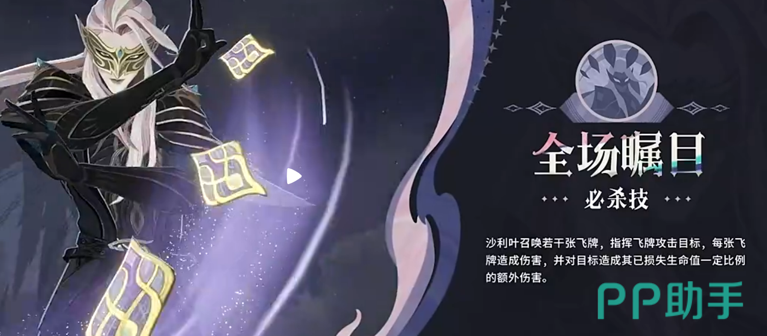 沙利叶的核心必杀技名为“全场瞩目”,这一技能不仅象征着他成为战场焦点,更体现了其对战局的精准干预能力。释放时,他会投掷飞牌对敌人造成物理伤害,并基于目标已损失的生命值追加额外打击效果。这种与敌方当前血量挂钩的增伤机制,使得他在对抗残血单位或持续压制高血量目标时都极具威胁。同时,飞牌具备多段命中判定,能够有效覆盖多个敌人,实现高效的群体输出。