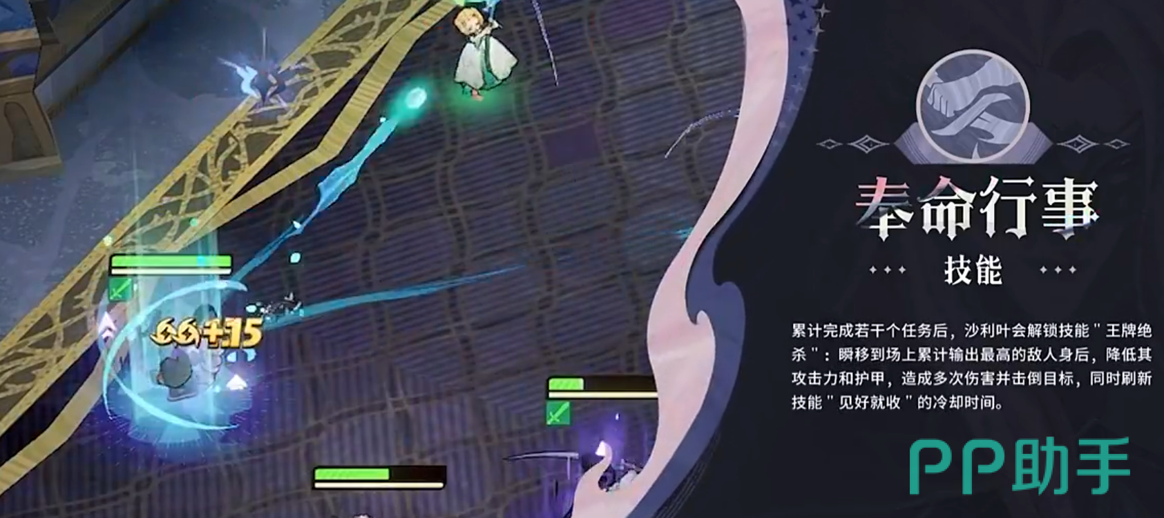 “奉命行事”是沙利叶团队协作能力的体现。战斗开始时,他会为部分队友分配特定任务,完成这些任务后可获得能量回复与攻击力提升的增益。更重要的是,当所有任务达成后,将解锁终极技能“王牌绝杀”。此技能使沙利叶瞬间出现在敌方最具威胁的角色身后,对其施加攻击力降低与护甲削减的负面状态,同时造成高额伤害。一旦成功击杀目标,其余技能冷却时间也将立即刷新,赋予他连续作战的强大续航能力。