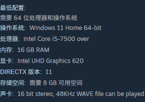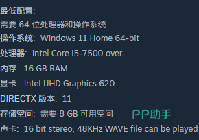 根据开发方公布的技术参数,该游戏最低运行配置为:Intel Core i5-7500处理器、16GB内存、集成显卡即可胜任;而推荐配置则进一步提升至Intel Core i5-8400处理器、16GB内存、NVIDIA GeForce GTX 1050独立显卡。该配置水平在当前主流中端PC中已属常规范畴,绝大多数近五年内购置的台式机或高性能笔记本均可稳定支持。