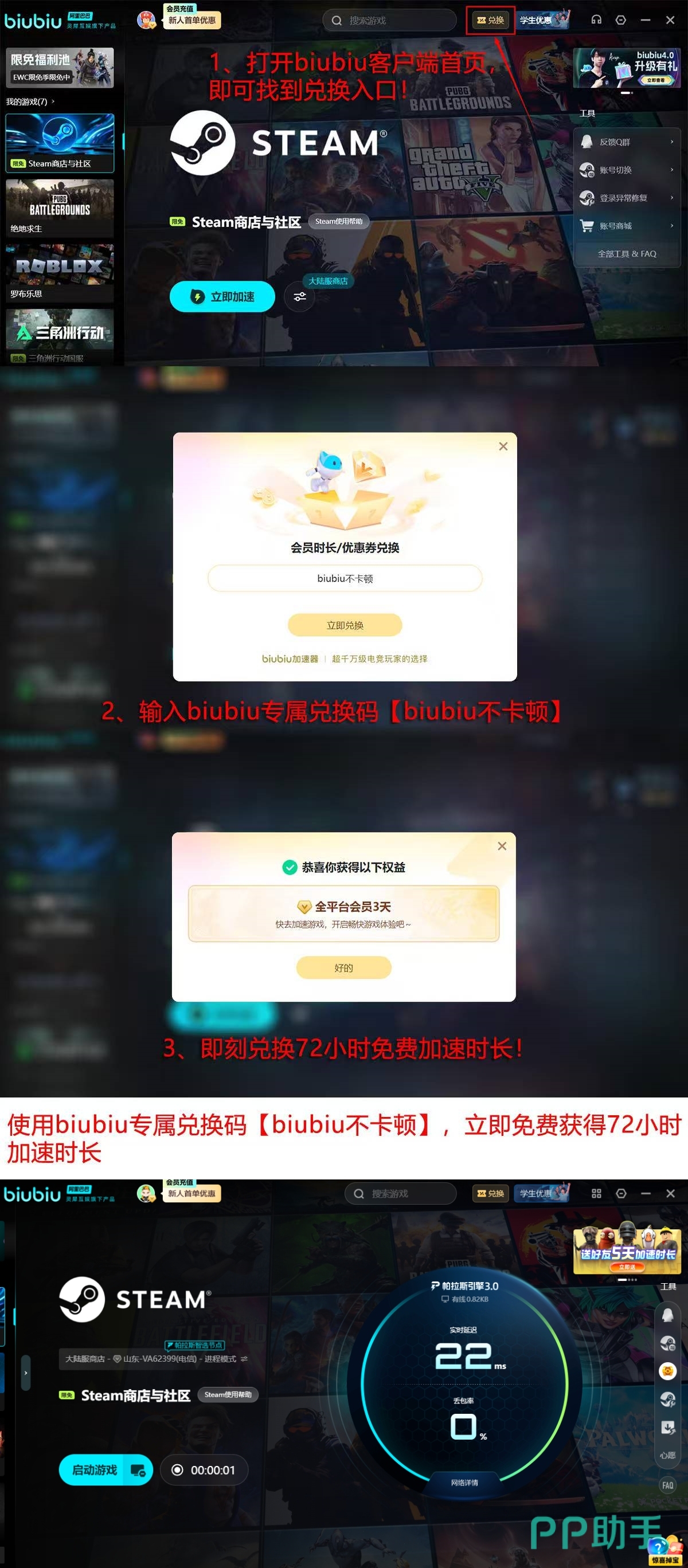 该加速器采用自研帕拉斯3.0引擎架构,在协议优化与节点调度方面具备显著技术优势,实际加速表现处于行业前列。其专业能力亦获得职业电竞领域认可——已与PUBG职业选手xdd建立长期技术合作。此外,用户还可通过活动获取实用权益:输入兑换码【biubiu不卡顿】可获72小时连续使用时长;新注册用户默认赠送24小时免费体验权限。