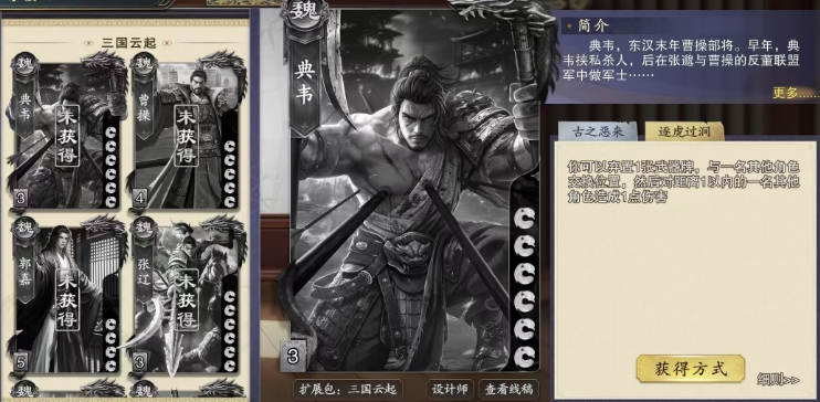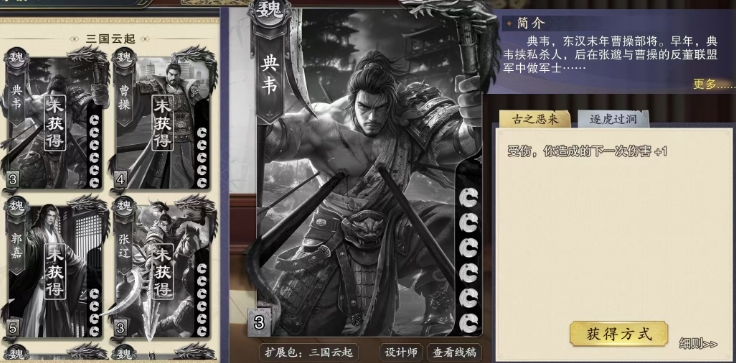 这位魏国阵营的悍将典韦初始便拥有六点体力,这一数值在众多武将中还是比较厚实,跟很多游戏当中设定为前排一样为他提供了坚实的生存基础,而他的一技能古之恶来,更是赋予了他惊人的爆发力与持续作战能力,每当典韦受到伤害时,这个技能便会触发,使得他下一次造成的伤害值增加1点,需要注意的是,这种增伤效果并非立即生效,而是会在典韦下一次造成伤害时一次性体现,且在此之前,所有的增伤效果都会累加。